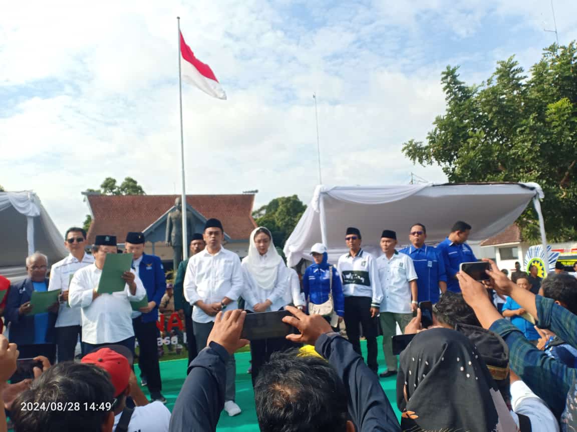 Mjnews.id – Kota Blitar menjadi saksi kehadiran ribuan kader dan simpatisan dari berbagai partai politik pada Rabu, 28 Agustus 2024 yang berkumpul untuk mengantar pasangan calon Wali Kota dan Wakil Wali Kota mendaftarkan diri ke Komisi Pemilihan Umum (KPU) Kota Blitar. Pasangan Ibin-Elim menjadi sorotan utama saat mereka secara resmi mengumumkan pencalonan di Istana Gebang, Sananwetan, Blitar, sebuah lokasi bersejarah yang merupakan kediaman ibu Presiden pertama Indonesia, Soekarno.